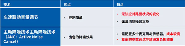 應(yīng)對(duì)音響環(huán)境變化,直接的方法就是用戶手動(dòng)調(diào)節(jié)音量。然而,在持續(xù)變化的路面環(huán)境下頻繁調(diào)節(jié)音量,會(huì)很大程度影響用戶體驗(yàn)。針對(duì)這一問(wèn)題,典型的現(xiàn)有技術(shù)——車(chē)速聯(lián)動(dòng)音量調(diào)節(jié)和ANC雖對(duì)車(chē)內(nèi)音響控制有所貢獻(xiàn),但各自仍存在挑戰(zhàn)。