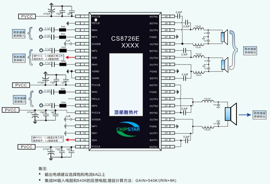CS8726E是-款4X70W四通道D類音頻功率放大器,這款器件在頂層設計了散熱焊盤,焊盤上連接散熱器后在供電電壓24V的情況下,最大可以輸出4x70W的連續(xù)功率.