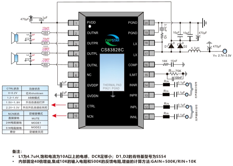 CS83828C是一款適用于單節(jié)鋰電池應用,固定增益,帶兩種防破音,AB/D切換,靜音功能,內(nèi)置BOOST升壓模塊的R類立體聲音頻功率放大器。