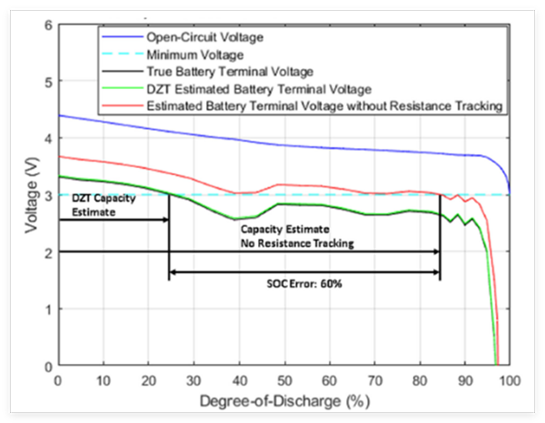 當(dāng)不穩(wěn)定或高頻負(fù)載影響電池時,阻抗跟蹤測量儀對電池的傳統(tǒng) RC 建模將無法更新電池電阻。動態(tài) Z-Track 算法實現(xiàn)了一個寬帶瞬態(tài)模型,該模型可以模擬電壓瞬態(tài)并適應(yīng)動態(tài)電流曲線。即使電流不穩(wěn)定,這種方法也能實時估算電阻。