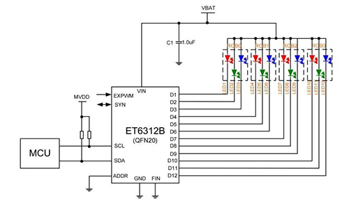 ET6312B 采用 I²C 總線接口,通過九個內(nèi)部寄存器可靈活配置呼吸周期、延遲時間、電流等級等參數(shù),EXPWM 引腳還支持外部 PWM 輸入擴展控制。這款集成溫度保護與超低壓差特性的驅(qū)動芯片,以 QFN20小巧封裝,為多通道 LED 控制系統(tǒng)提供高效穩(wěn)定的解決方案。