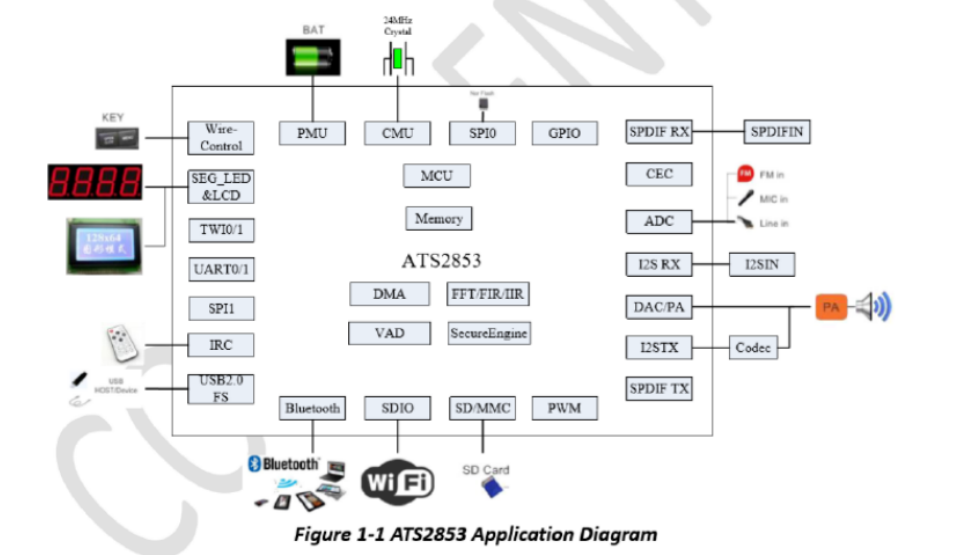 ATS2853只支持經(jīng)典藍牙,可以利用TWS機制實現(xiàn)高集成度和極高性價比的soundbar+subwoofer產(chǎn)品;