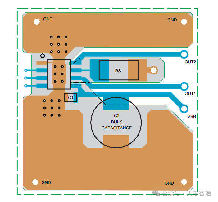 1、作為功率器件,需要考慮出線線寬與接地焊盤的地孔數(shù)量,以及電流檢測電阻的回路、功率,可參考官方給出的具體布線圖。