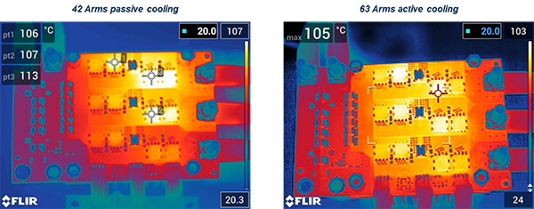 在常規(guī)組裝狀態(tài)下,MOSFET器件不可見。為檢測(cè)其實(shí)際溫度,我們采用定制線纜將功率板與控制板重新布置為共面并列結(jié)構(gòu)。通過熱像儀拍攝功率板溫度分布:初始測(cè)試關(guān)閉風(fēng)扇,電機(jī)以42A(有效值)正弦電流運(yùn)行,在25℃環(huán)境溫度下約15分鐘達(dá)到熱平衡狀態(tài)。板面最高溫度點(diǎn)出現(xiàn)在低側(cè)MOSFET,達(dá)到113℃(圖4左)。隨后開啟風(fēng)扇并將輸出電流提升至63A(有效值),相同最熱MOSFET的最高溫度降至105℃(圖4右),這得益于強(qiáng)制氣流使板卡至環(huán)境的熱阻顯著降低。需說明的是,當(dāng)兩塊電路板堆疊安裝時(shí),預(yù)計(jì)最高溫度將高于本次測(cè)試值,但STL160N10F8器件允許的結(jié)溫高達(dá)175℃,仍能確保驅(qū)動(dòng)器在全功率運(yùn)行時(shí)的設(shè)計(jì)裕量與安全可靠性。