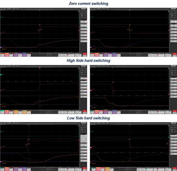 空載時(shí)開關(guān)特性非常潔凈,MOSFET電壓與輸出電壓的上升/下降沿壓擺率均約為0.83V/ns。但當(dāng)輸出電流達(dá)到90A峰值時(shí),測(cè)量電壓出現(xiàn)擾動(dòng),這歸因于功率級(jí)路徑中的寄生電感。得益于STSPIN32G4及功率MOSFET的魯棒性,這些擾動(dòng)仍在安全范圍內(nèi):低側(cè)硬開關(guān)關(guān)斷控制的上升沿最大過沖約5.3V;高側(cè)硬開關(guān)關(guān)斷控制的下降沿測(cè)得對(duì)地負(fù)向電壓約-27V(該脈沖經(jīng)板對(duì)板連接器濾波后至控制板端衰減至-10V)。
