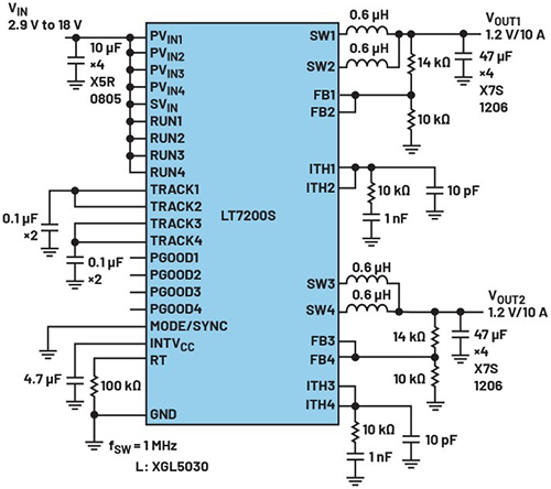 隨著數(shù)據(jù)速度的提升和工作負(fù)載的增長,F(xiàn)PGA和SoC不斷演進(jìn),以滿足不斷上升的速度和容量需求。電源也必須隨之發(fā)展,在提供更大電流的同時(shí),實(shí)現(xiàn)更高的功率密度。此外,簡便性和可靠性同樣重要。對(duì)于需要15 A以上電流的系統(tǒng),可以并聯(lián)多個(gè)LT7200S穩(wěn)壓器并錯(cuò)相運(yùn)行,確保功率輸送高效穩(wěn)定。圖1和圖2展示了LT7200S的典型應(yīng)用原理圖,它支持雙相和四相操作,通過并聯(lián)為負(fù)載提供更高的輸出電流。這款器件采用四相架構(gòu),四個(gè)內(nèi)部同步降壓型穩(wěn)壓器通道能夠高效并聯(lián)。每個(gè)通道能夠輸出或吸收±5 A的電流。當(dāng)四相并聯(lián)時(shí),合計(jì)可向公共輸出端提供高達(dá)±20 A的電流。而這是通過精密電流模式控制實(shí)現(xiàn)的,它能確保所有通道間精確均流,從而提升熱平衡和系統(tǒng)可靠性。
