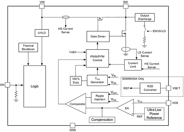 器件提供靈活的輸出電壓方案:SGM6000A 通過(guò) VSET 引腳可在 0.7V 至 3.3V 之間任意設(shè)定,而 SGM6000B 則內(nèi)部固定 0.6V、0.8V、1.2V 或 1.8V 四檔常用電平,方便客戶根據(jù)主芯片需求直接選用。芯片內(nèi)置多種保護(hù)機(jī)制,并帶有主動(dòng)放電功能,可快速釋放輸出電容能量;同時(shí)最大限度地減少外部元件數(shù)量,僅需兩個(gè)貼片電容和一個(gè)電感即可工作,方案占板面積僅 27.4mm²。