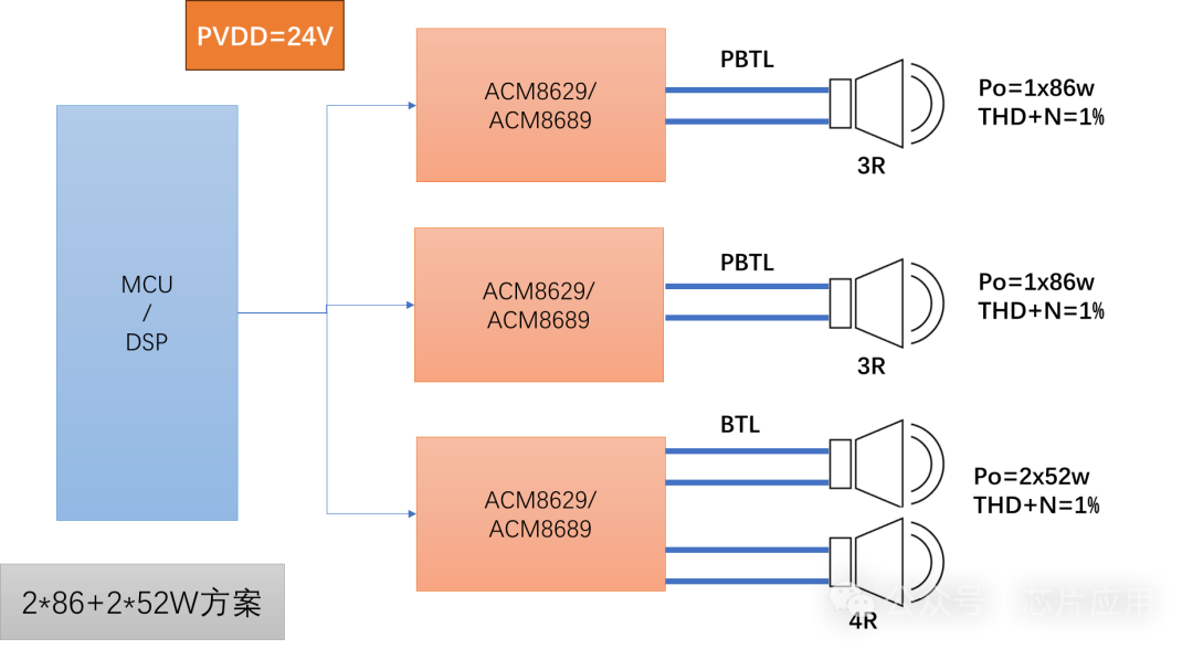 ACM8629/8689 散熱pad朝上加上散熱片輔助能快速散熱,提高功率。8629/8689硬件性能一致,區(qū)別是8689有更豐富的DSP算法,例如兩組DRB,peak DRC技術(shù)等。三顆芯片共用一組I2C和一組I2S,走線簡(jiǎn)潔,功放內(nèi)部分頻,調(diào)試更快捷。
