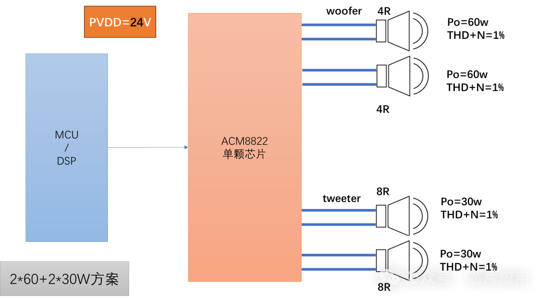 ACM8822是4通道產(chǎn)品,內(nèi)部FET阻抗65毫歐,比8629更低,單通道輸出功率也大于8629;芯片4通道設(shè)計(jì),并且內(nèi)部支持EQ分頻,對(duì)于2.2產(chǎn)品非常便捷。重點(diǎn):ACM8822同樣支持動(dòng)態(tài)升壓classH。