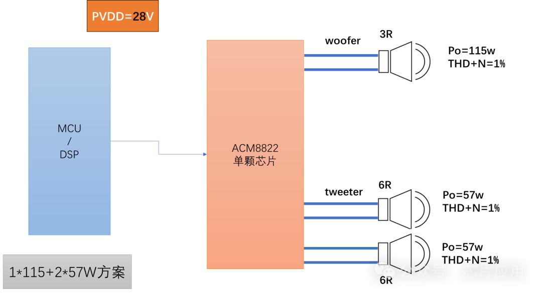 CM8822應(yīng)用靈活,可以配置為2.1聲道,8822的特點(diǎn)是工作電壓寬,PVDD可以在4.5-30V電壓范圍。為了更好的動(dòng)態(tài),可以將工作電壓設(shè)為28V,做1*115W+2*57W的組合應(yīng)用。