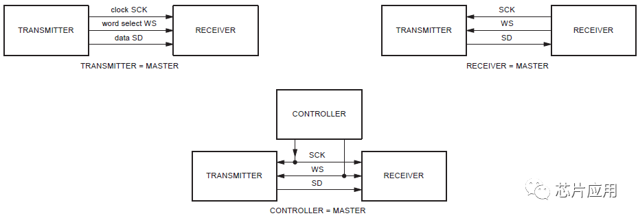I2S是比較簡單的數(shù)字接口協(xié)議,沒有地址或設(shè)備選擇機(jī)制。在I2S總線上,只能同時存在一個主設(shè)備和發(fā)送設(shè)備。主設(shè)備可以是發(fā)送設(shè)備,也可以是接收設(shè)備,或是協(xié)調(diào)發(fā)送設(shè)備和接收設(shè)備的其它控制設(shè)備。在I2S系統(tǒng)中,提供時鐘(SCK和WS)的設(shè)備為主設(shè)備。圖3是常見的I2S系統(tǒng)框圖。