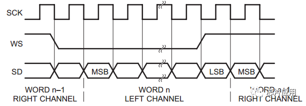 WS也稱幀時鐘,即LRCLK/Left RightClock。WS頻率等于聲音的采樣率。WS既可以在SCK的上升沿,也可以在SCK的下降沿變化。從設(shè)備在SCK的上升沿采樣WS信號。數(shù)據(jù)信號MSB在WS改變后的第二個時鐘(SCK)上升沿有效(即延遲一個SCK),這樣可以讓從設(shè)備有足夠的時間以存儲當(dāng)前接收的數(shù)據(jù),并準(zhǔn)備好接收下一組數(shù)據(jù)。
