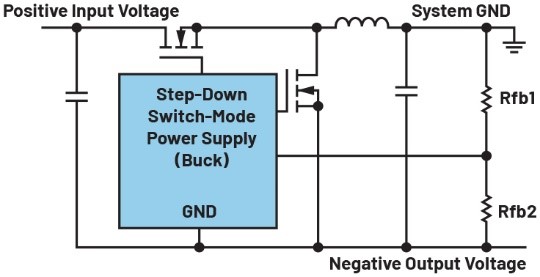 然而,有時電壓需要反相。在大多數情況下,需要將正電源電壓轉換為負電壓。這是為了給信號路徑中的傳感器供電,使其能夠處理具有正負電壓偏轉的信號。例如,+5V和-5V用作運算放大器的電源,以處理信號電壓。某些應用需要負電壓來安全關斷MOSFET的柵極。要從現有正電壓產生負電壓,圖1所示的反相拓撲是合適的方案。其中,正電壓被轉換為負電壓。這種電路結構簡單,不需要變壓器,可以利用標準降壓型開關穩(wěn)壓器IC構建。降壓型穩(wěn)壓器的輸出電壓連接至系統(tǒng)接地端,GND引腳電壓產生負電壓,該負電壓可通過電阻分壓器Rfb1和Rfb2進行調節(jié)。