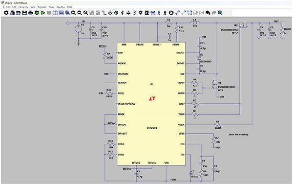 為了在較高功率下也能實現平穩(wěn)的切換,可以使用專用開關穩(wěn)壓器IC來有效完成從負電壓到正電壓的轉換。LTC7899就是這樣的IC。它是一款開關電源升壓轉換器控制器,專為將負電壓轉換為正電壓而設計。它使用外部開關,而且同步工作,并在輸入和輸出之間提供高達135 V的極寬電壓范圍。圖3顯示了仿真程序LTspice®中的LTC7899反相電路實現方案,用戶可借助該軟件對電路進行仿真分析。