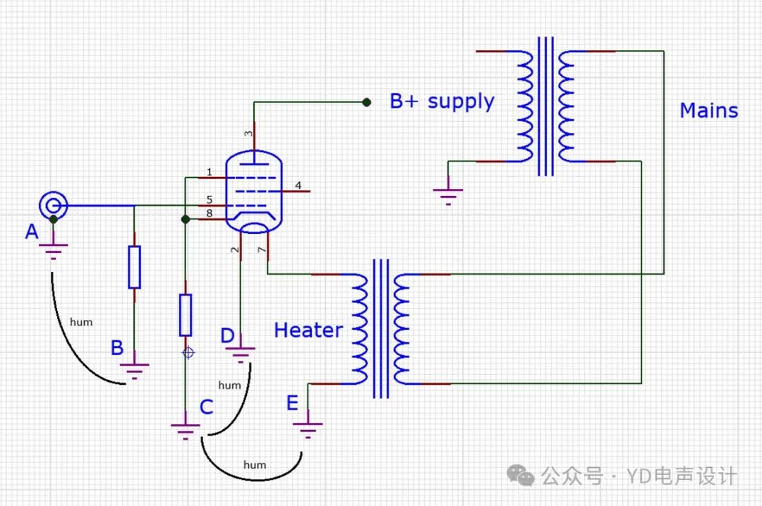 但到達(dá)放大器輸入的信號(hào)是什么?看圖2。放大器輸入信號(hào)是網(wǎng)格和陰極之間的信號(hào),Vgk。如果所有接地點(diǎn)A到E的電壓相同,那正是輸入信號(hào)——摩擦就在那里!例如,假設(shè)加熱器返回電流在D點(diǎn)和E點(diǎn)之間流動(dòng),由一些電線和/或底盤的一部分連接——由于它們之間的阻抗/電阻,這些點(diǎn)之間可能會(huì)造成嗡嗡聲電壓。因此,例如,如果A點(diǎn)連接到B點(diǎn),C點(diǎn)和D點(diǎn)在E點(diǎn)連接(常見情況),并且B點(diǎn)和E點(diǎn)之間有一些電線和/或底盤部分,您幾乎可以保證電網(wǎng)和陰極之間的嗡嗡聲電壓和嗡嗡聲會(huì)從揚(yáng)聲器中出來。(我正在掩蓋保護(hù)地球(PE)連接的問題,這可能會(huì)使整個(gè)事情復(fù)雜化)。