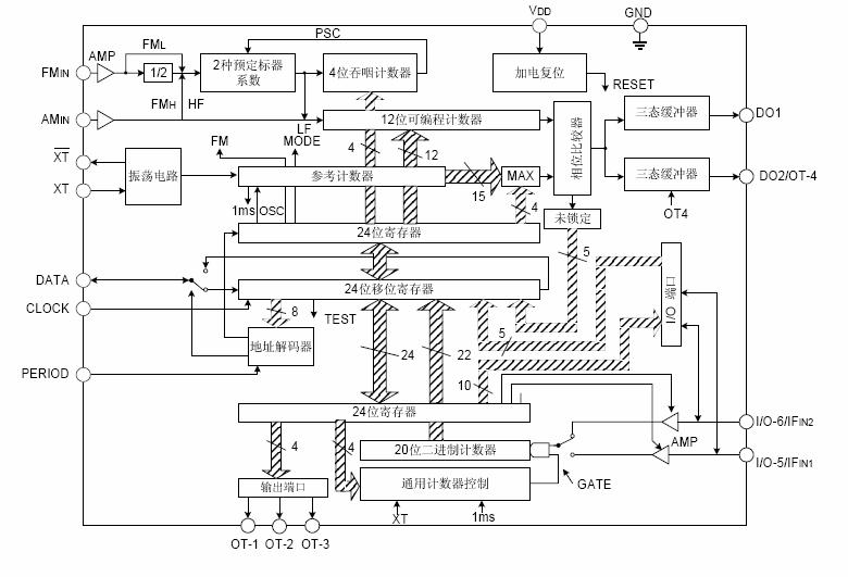 * 內(nèi)置20位通用計(jì)數(shù)器,用來測量中頻頻率(IFIN1和IFIN2)。