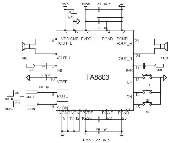 固定20倍增益,4種防破音可選,AB/D切換功能,2X4.8W輸出功率,立體聲音頻功率放大器 |