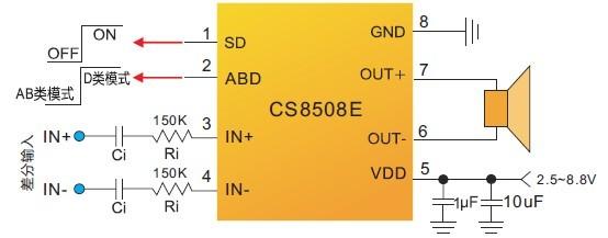 CS8508E是一款高效率,超低EMI8.0W單聲道音頻放大器。在電源電壓為7.4V的情況下,CS8508E可以為4歐的負載輸出6.8W的功率。CS8508E 無需濾波器的PWM調(diào)制結(jié)構(gòu)減少了外部元件、PCB面積和系統(tǒng)成本,而且也簡化了設(shè)計。2.5~8.8V寬電壓工作范圍,D類模式高達90%的效率,,AB類D類模式可切換的Ω 的負載輸出6.8W的功率。在D類模式下快速的啟動時間和纖小的封裝尺寸使得CS8508E成為雙節(jié)鋰電池在串聯(lián)的電源供電情況下最適用的音頻功放。