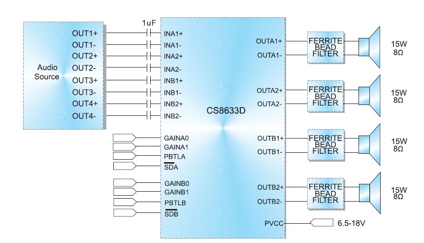 擴頻技術(shù),固定40倍增益,差分輸入,2X15W+30W 2.1聲道專用D類音頻功放 |