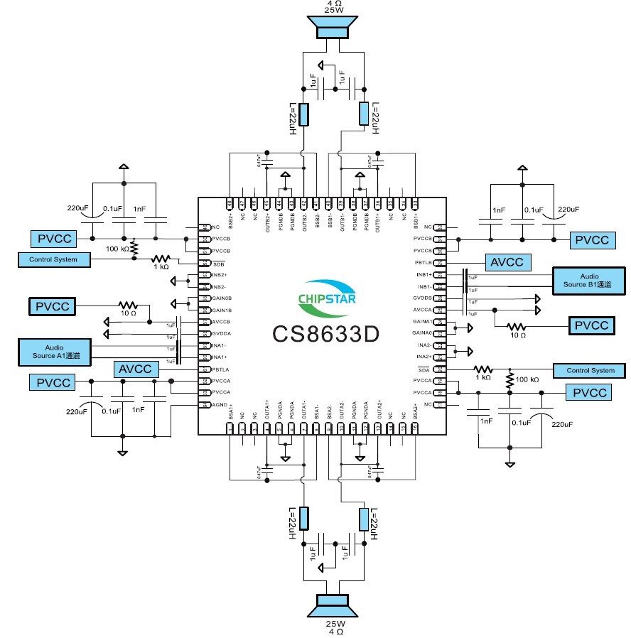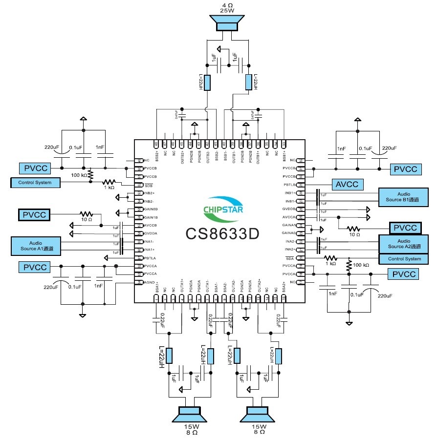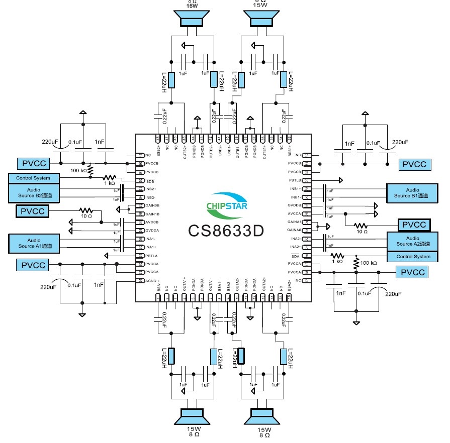 可使用單面PCB、免濾波、30W單聲道D類音頻功放IC,管腳兼容CS8622 |