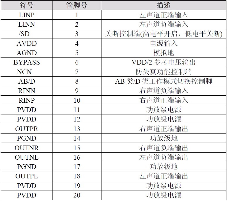 具有防破音功能的免電感濾波2×20W D類立體聲音頻功放 |
