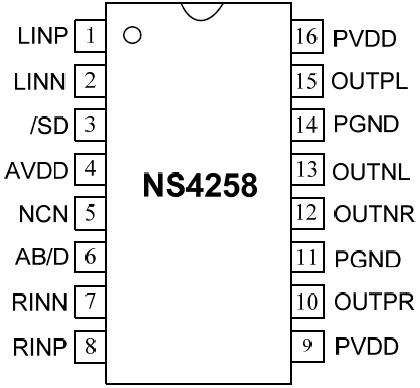 2×22W(VDD=14V, RL=4Ω, THD+N=10%)或34W (VDD=16V, RL=4Ω, THD+N=10%) |