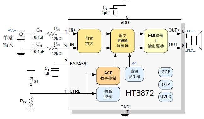 HT6872(4.7W防削頂單聲道D類音頻功率放大器) |