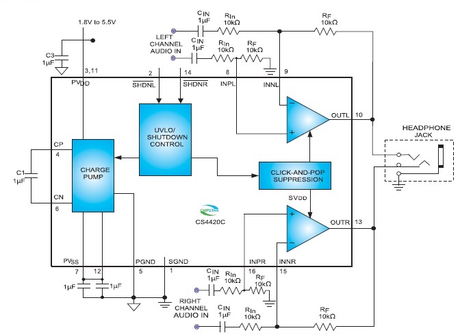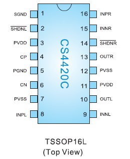CS4420 工作在1.8V至5.5V單電源下,僅消耗5mA電源電流,具有短路保護(hù)與熱過載保護(hù),額定溫度范圍是-40°C至+85°C。CS4420 采用16引腳TSSOP封裝,。