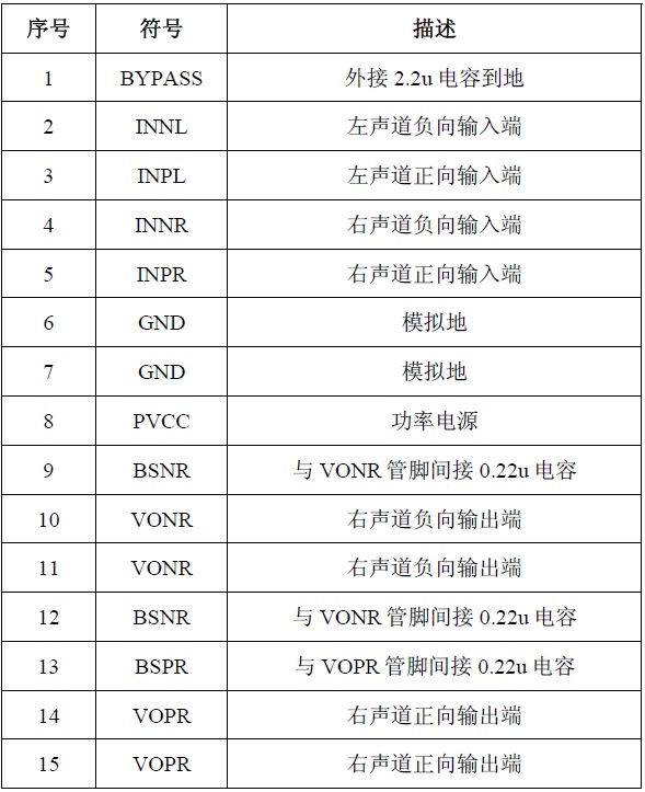 2×20W (VDD=14.5V, RL=4Ω, THD+N=1%) 或2×25W (VDD=14.5V, RL=4Ω, THD+N=10%) |
