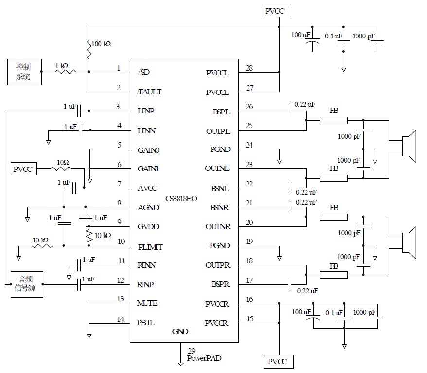 CS3818可以驅(qū)動低至4Ω 負載的立體聲揚聲器,具有高達90%的效率,使得在播放音樂時不需要額外的散熱器。