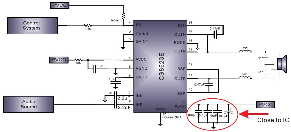 CS8623(可使用單面PCB、免濾波、30W單聲道D類音頻功放IC) |