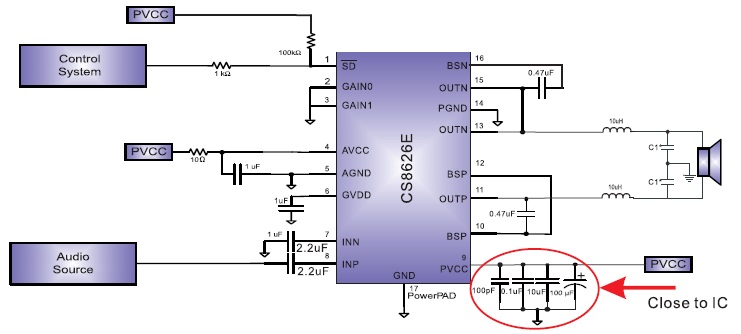 CS8626E內(nèi)置了過流保護(hù),短路保護(hù)和過熱保護(hù),有效的保護(hù)芯片在異常的工作條件下不被損壞。CS8626E可以驅(qū)動(dòng)低至4Ω 負(fù)載的揚(yáng)聲器 ,最高可提供55W的連續(xù)功率;CS8626E具有高達(dá)92%的效率,使得在播放音樂的時(shí)候不需要額外的散熱器。