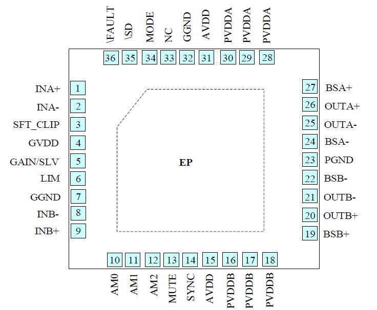 I2S數(shù)字輸入33W立體聲D類音頻功放芯片、內(nèi)置DSP小音量低頻增強(qiáng)等算法 |