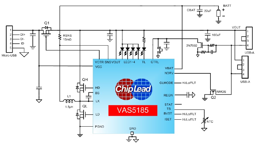 VAS5185是一款鋰電池充電管理與升壓DC/DC的單芯片專用IC,其應(yīng)用時僅需極少的外圍器件,有效降低BOM成本,適用于單節(jié)鋰離子/鋰聚合物電池的移動電源充放電管理。 |