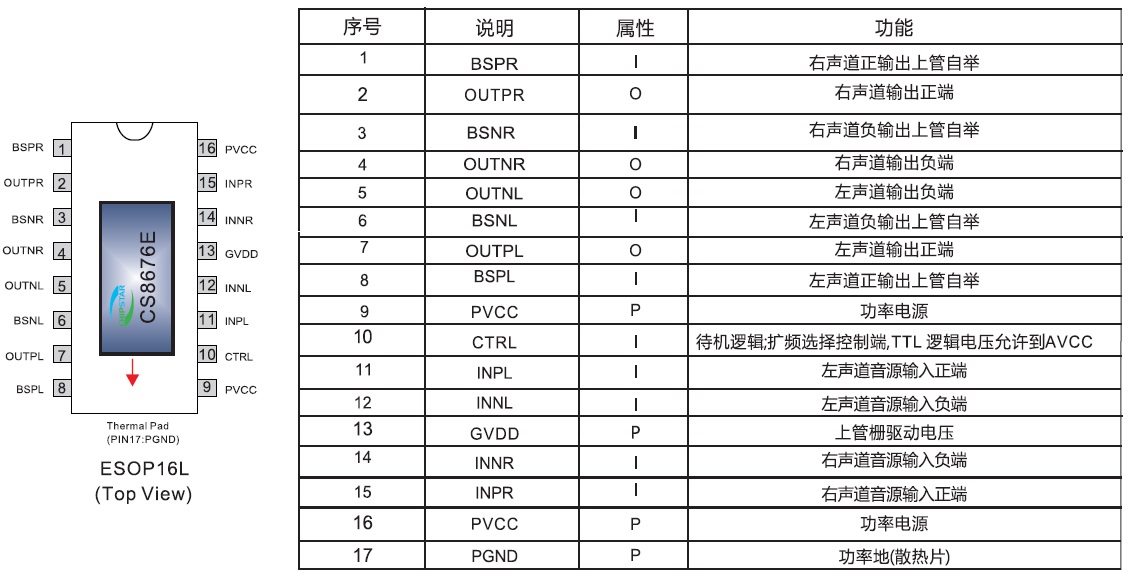 CS8676(擴(kuò)頻功能、低空載電流、免輸出電感、2X20W雙聲道/40W單聲道D類音頻功放IC) |
