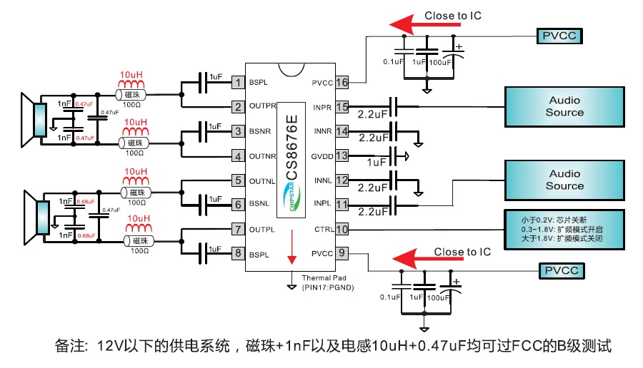 當(dāng)前位置:首頁(yè)->產(chǎn)品展示->功放IC->CS8676(擴(kuò)頻功能、低空載電流、免輸出電感、2X20W雙聲道/40W單聲道D類音頻功放IC) |
