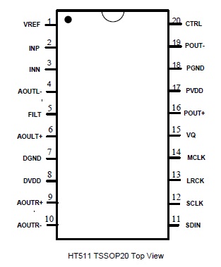 HT511集成的 D類音頻功放還具有增益可調(diào)、防破音等功能。