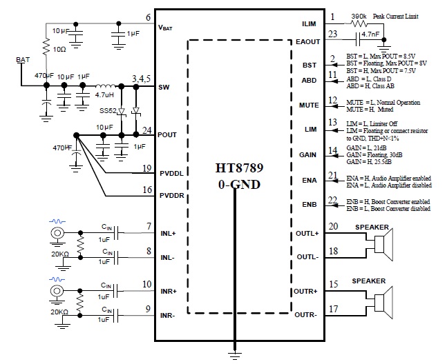 HT8789是一款內置自適應H類多段升壓的立體聲D類音頻功率放大器,由鋰電池供電升壓至VPOUT=8.5V時, THD+N=1%、1kHz信號條件下,能連續(xù)輸出2×7W功率(4Ω負載)。