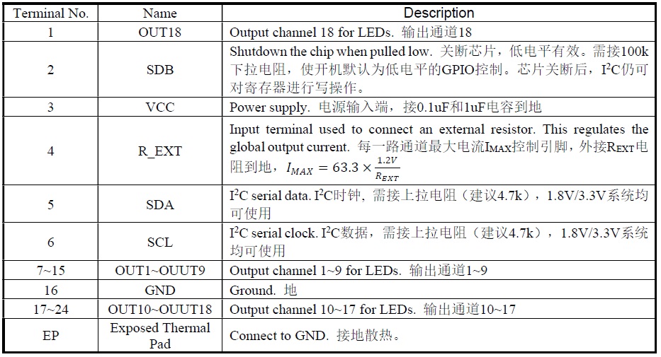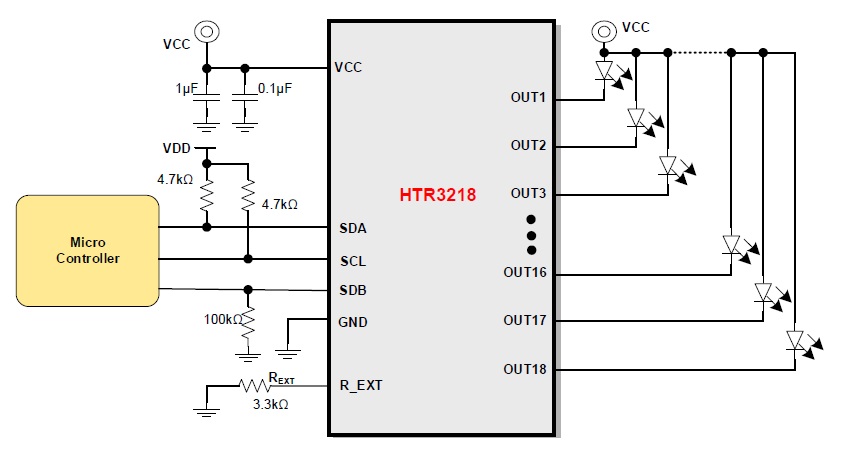 HTR3236是一款36路LED PWM驅(qū)動(dòng)器,PWM頻率可固定為3kHz或22kHz。每一路最大輸出電流可通過(guò)外置電阻REXT調(diào)節(jié),最大38mA,并