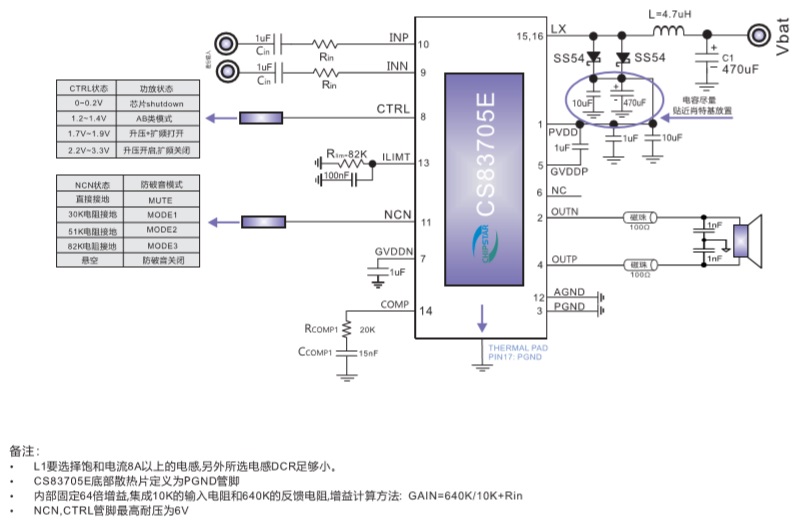 CS83705E的全差分架構(gòu)和極高的PSRR有效地提高對(duì)RF噪聲的抑制能力。無(wú)需濾波器的PWM調(diào)制結(jié)構(gòu)及內(nèi)置的BOOST升壓模塊,以及CS83705E采用專有的AERC((Adaptive Edge Rate Control)技術(shù),在音頻全帶寬范圍內(nèi)極大地降低了EMI的干擾,對(duì)60cm的音頻線,在FCC的標(biāo)準(zhǔn)下具有超過20dB的裕量,另外CS83705E內(nèi)置了過流保護(hù),短路保護(hù)和過熱保護(hù),有效的保護(hù)芯片在異常的工作條件下不被損壞。