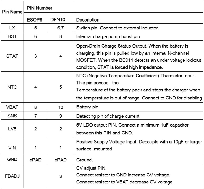BC911是一款4V-18V寬電壓輸入,支持單節(jié)鋰電池或磷酸鐵鋰電池的降壓充電管理IC。BC911具有3.5A的充電電流能力,充電電流可以通過(guò)外部電阻靈活可調(diào), 充電效率可以達(dá)到93%以上;恒壓充電電壓可調(diào)(電壓點(diǎn)3.2V-5.2V可調(diào),僅限于DFN-10封裝),實(shí)現(xiàn)對(duì)多類型如單節(jié)鋰電池(4.2V/4.35V/4.4V)、磷酸鐵鋰電池的充電管理。 |
