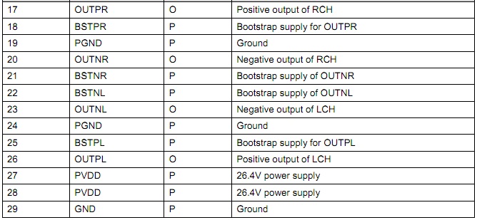 2x30W @1%THD+N into 8Ω BTL at 24V |