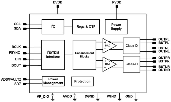 I2S數(shù)字輸入33W立體聲D類音頻功放芯片、內(nèi)置DSP小音量低頻增強等算法 |