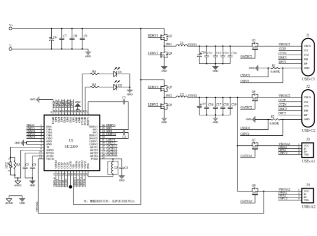 M12369 是一款面向大功率快充應用的電源管理 SOC,集成了微處理器、雙路降壓變換器、快充協(xié)議控制 器,支持 PD3.1、QC3.0、SCP、FCP、AFC、BC1.2 DCP 等全部主流快充協(xié)議,結合少量元件即可組成雙C 口的 140W大功率快充解決方案;輔以 DC-DC 芯片,還可擴展為3路獨立的C+C+AA多口大功率快充解決方案。