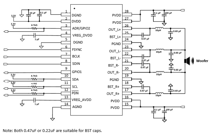 I2S數(shù)字輸入33W立體聲D類音頻功放芯片、內(nèi)置DSP小音量低頻增強等算法 |