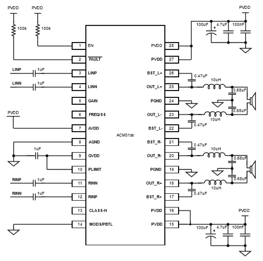 ACM3129A 在4Ω負載下可以輸出立體聲2X57W,或者單通道2Ω負載下輸出1X110W,失真度都是THD+N=1%的條件下測試。ACM3129A 是一款高效率的D類音頻功放。采用新型專利技術(shù)動態(tài)PWM,降低全輸出段的功耗。 ACM3129A工作電壓范圍在4.5-26.4V,輸出配置可以立體聲BTL,也可以單通道PBTL。為降低EMI 噪聲,ACM3129A提供了兩個頻率的展頻選項 (384kHz, 480kHz),在一定條件下可以免電感。 ACM3129A還提供了全差分輸入,pop音抑制,提供 4 種增益選擇等功能(20dB,26dB,30dB and 34dB)。