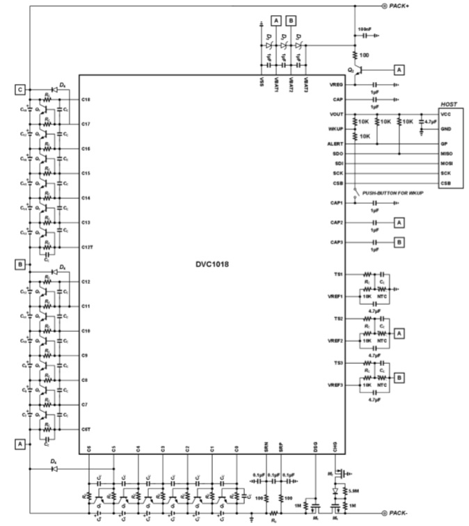 DVC1018是一款采用車規(guī)級高壓BCD工藝設計的9-18節(jié)鋰電池組監(jiān)控芯片,通過四線式SPI接口與上位機進行通信,形成一套完整的電池組管理系統(tǒng)(BMS)。