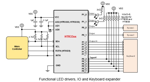 HTR3335是一款I2C SMBus IO 擴展器 , 2.2V~5.5V電源供電。16個IO端口中的任何一個都可以單獨配置為輸入或輸出。此外,任一IO可驅動LED |