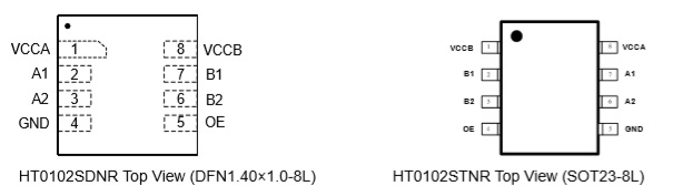 HT0102是一款2路雙向電平轉換器,其使用兩個獨立的供電VCCA和VCCB。電壓較低的電平信號接入A端口,支持1.65V~5.5V電壓,其對應VCCA; 電壓較高的電平信號接入B端口,支持2.3V~5.5V電壓,其對應VCCB。 |