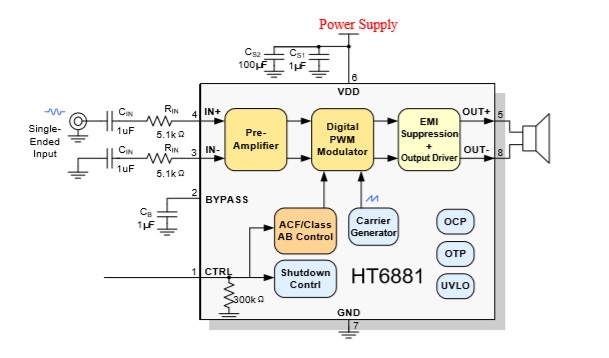 HT6881內(nèi)部集成免濾波器數(shù)字調(diào)制技術(shù),能夠直接驅(qū)動揚聲器,并最大程度減小脈沖輸出信號的失真和噪音。輸出無需濾波網(wǎng)絡(luò),極少的外部元器件節(jié)省了系統(tǒng)空間和成本,是便攜式應(yīng)用的理想選擇。 此外,HT6881內(nèi)置的關(guān)斷功能使待機電流最小化,還集成了輸出端過流保護、片內(nèi)過溫保護和電源欠壓異常保護等功能。